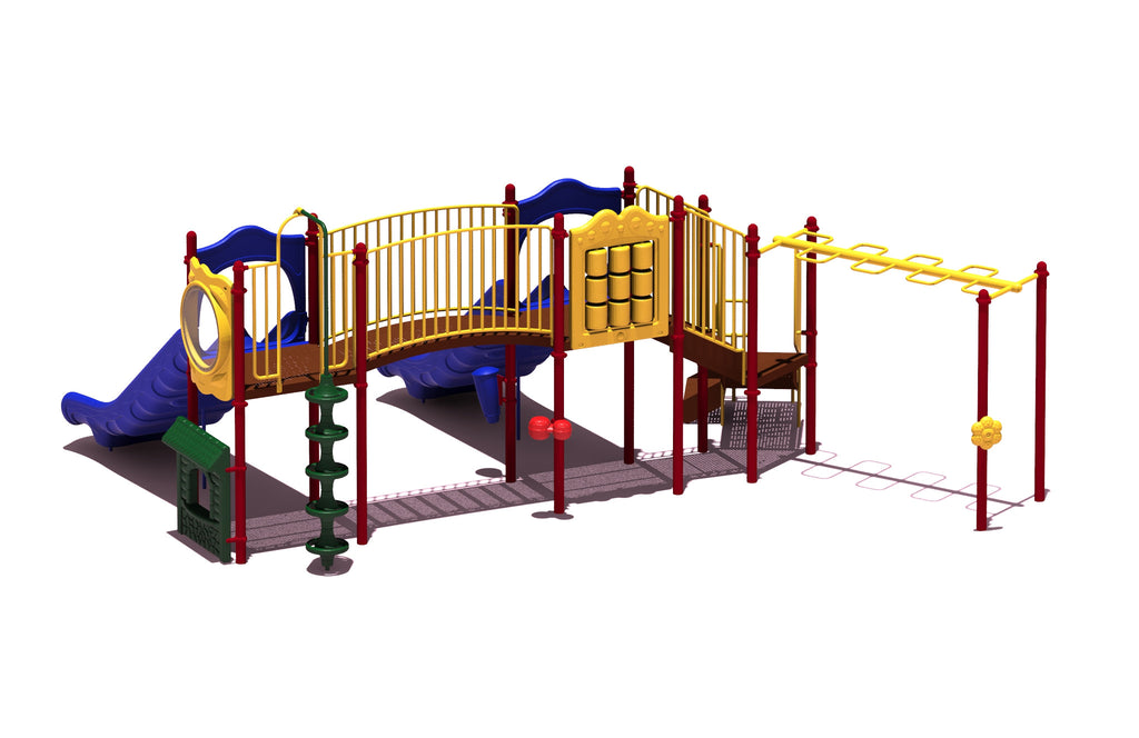 Get ready to explore atop Mount Macon! Featuring two Double Slides, this structure allows up to four children to slide at the same time, making this system ideal for any playground. The challenging Overhead Climber and Beanstalk Climber help build upper body strength and develop hand-eye coordination. Children will have fun developing sensory-motor skills with the Window and Game Panel. An accessible Store Panel and three ground-level music components inspire children to use their imagination through the creative play.